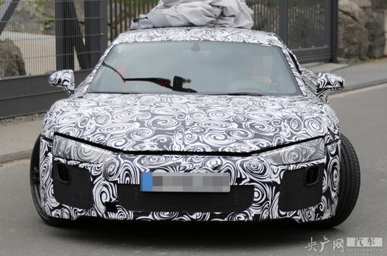 由于偽裝較少,車身輪廓已經比較清晰,車身尺寸與現款R8相近。前大燈集合了LED日行燈。我們可以看到車頭兩側的大口徑散熱口,但進氣格柵的面積有所縮減,并使用了全新設計的前大燈。