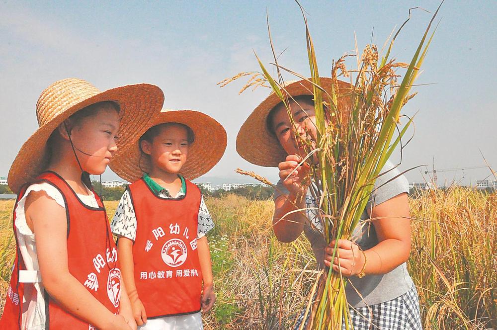 10月13日,黟縣碧陽幼兒園的孩子們在橫崗村稻田里聽老師講解稻谷的知識,“零距離”觀察稻子生長,樹立愛惜糧食意識和習慣。本報通訊員朱光明攝