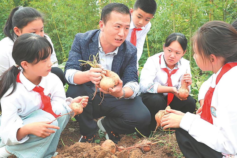 10月14日,六安市裕安區(qū)淠河小學的老師在學校“早竹園”勞動實踐基地帶領同學們挖紅薯,通過開展農(nóng)事體驗勞動,引導孩子們自覺傳承勤儉美德。本報通訊員 田凱平 羅成 攝