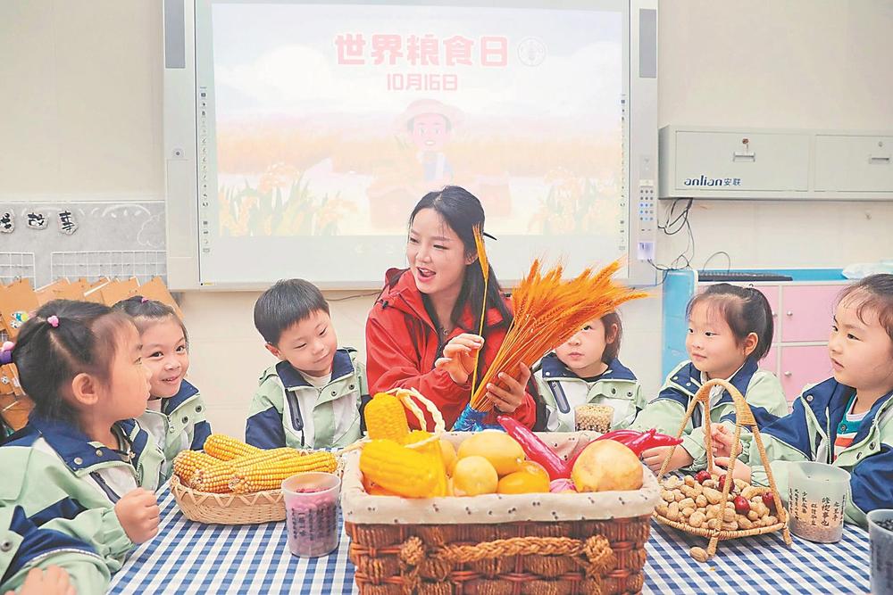 10月15日,淮北市第二實驗幼兒園,老師教小朋友認識玉米、稻谷等五谷雜糧。在10月16日世界糧食日到來之際,該幼兒園開展主題教育活動,培養(yǎng)孩子們愛惜和節(jié)約糧食的意識。本報通訊員萬善朝攝