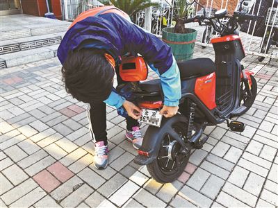 一位市民為自己的電動(dòng)自行車(chē)換上剛辦好的號(hào)牌攝影/孔令晗