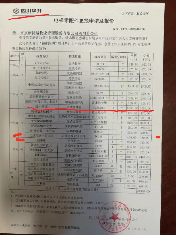 去年修電梯,“華升富士達”給的報價單,同一個零件,型號完全相同,同一家公司,價格相差一倍
