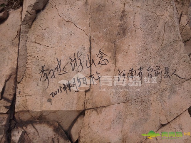 我看了一下李子忠的留言,都是用馬克筆書寫。在一塊石頭上他寫到:李子忠游山念,2015年4月5日下午,河南省臺前縣人;在另一塊石頭上又寫到:2015年4月5日李子忠全家游此山留念,清明節(jié);還有李子忠游山到頂。2015年4月5日清明節(jié)這天,李子忠就給浮山的三塊巨石留下了自己的“潑墨”。