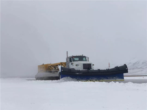 工作人員正在清理停機(jī)坪積雪(圖片由民航西藏區(qū)局提供)
