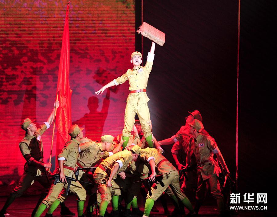 7月29日,演員們?cè)诒硌菸璧浮督夥拧。?dāng)日,黔陜冀紀(jì)念中國(guó)人民解放軍建軍90周年主題文藝演出在貴陽(yáng)市舉行。此次文藝演出由貴州、陜西和河北三省文藝團(tuán)體聯(lián)袂打造,通過(guò)豐富多彩的節(jié)目,反映中國(guó)共產(chǎn)黨帶領(lǐng)紅軍進(jìn)行長(zhǎng)征,建立紅色根據(jù)地,帶領(lǐng)人民軍隊(duì)開(kāi)展抗日戰(zhàn)爭(zhēng)解放戰(zhàn)爭(zhēng),實(shí)現(xiàn)民族獨(dú)立、國(guó)家富強(qiáng)的偉大功績(jī)。新華社記者 陶亮 攝