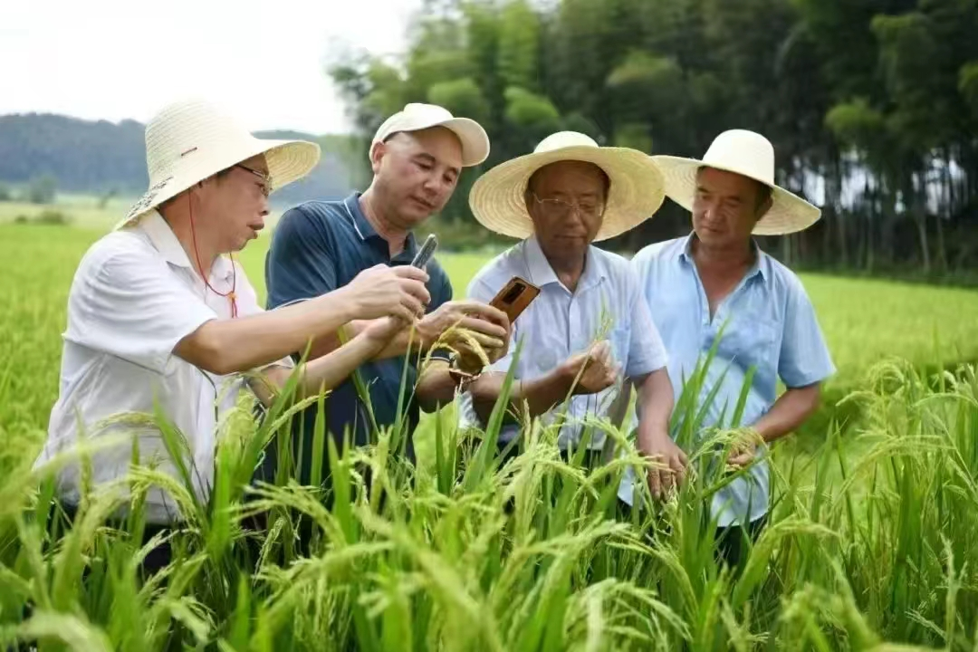 謝華安院士(右二)在建寧制種基地查看雜交水稻長(zhǎng)勢(shì)(建寧縣融媒體中心供圖)