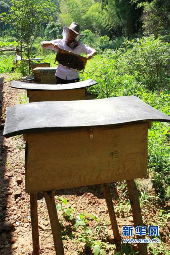 7月22日,陳村蜂農(nóng)在養(yǎng)蜂場(chǎng)進(jìn)行日常管理。 新華社發(fā)(陳柏材 攝)