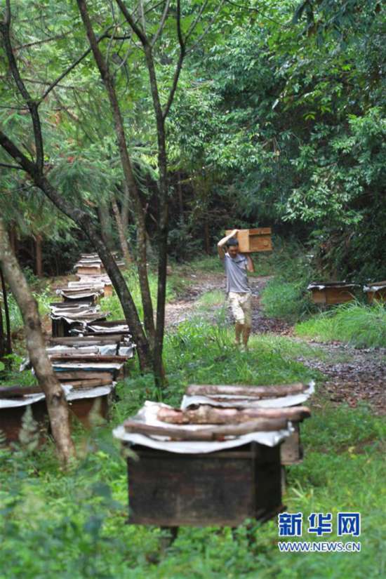 7月22日,陳村蜂農(nóng)在養(yǎng)蜂場(chǎng)進(jìn)行日常管理。新華社發(fā)(陳柏材 攝)