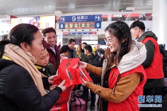 當(dāng)日,溫暖回家路——“青春志愿行 奉獻(xiàn)新時代”暖冬行動萬名志愿者在行動暨“奮斗的人生是幸福的人生”新春贈聯(lián)等活動在福州火車站舉行。 新華社記者 林善傳 攝