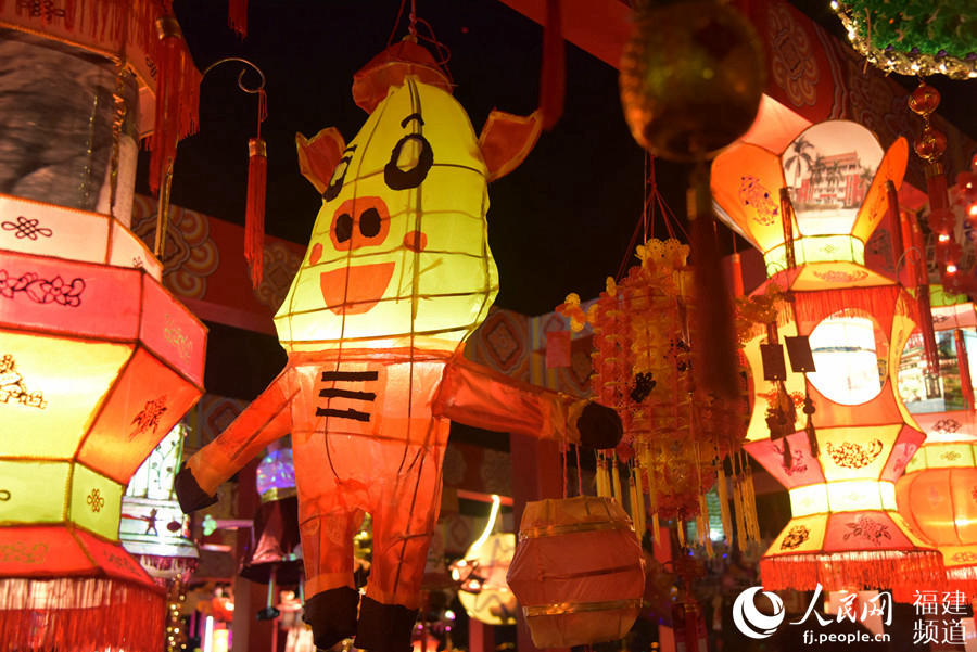 武榮公園花燈展區(qū),最引人注目的是那些充滿童趣的花燈。這里展出的200余盞花燈中,有100盞是來自學(xué)校師生的手工創(chuàng)意花燈。抬頭望去,熊貓、小船、菠蘿、月亮、財神爺、獅子頭等形態(tài)各異的造型花燈爭相競艷,其中,還有不少豬年元素和南安本土文化特色元。