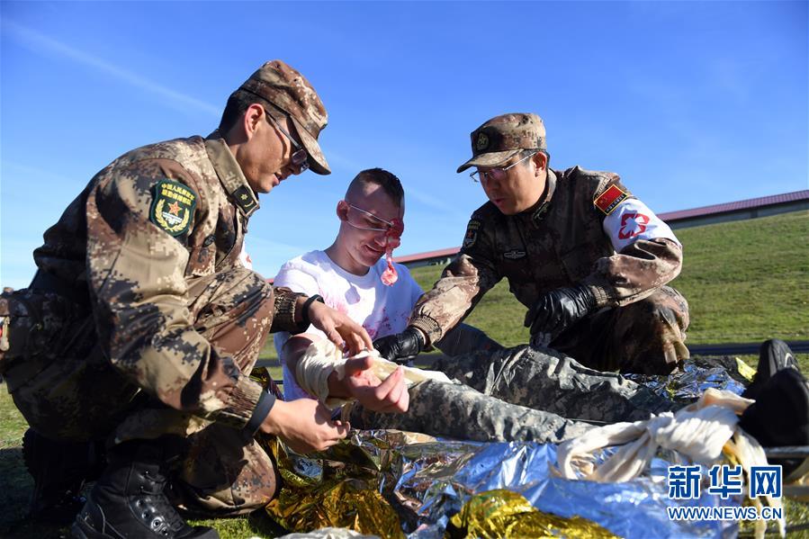 11月18日,在美國俄勒岡州錫賽德的國民警衛(wèi)隊(duì)拉里葉軍營,中美兩軍參演人員一同救治“傷員”。中美兩軍人道主義救援減災(zāi)聯(lián)合實(shí)兵演練當(dāng)日進(jìn)入第三天。此次聯(lián)合演練中美兩軍共派出200余人參加。新華社記者殷博古攝 -