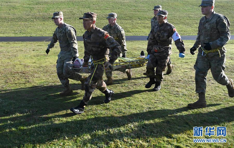 11月18日,在美國俄勒岡州錫賽德的國民警衛(wèi)隊(duì)拉里葉軍營,中美兩軍參演人員一同運(yùn)送“傷員”。中美兩軍人道主義救援減災(zāi)聯(lián)合實(shí)兵演練當(dāng)日進(jìn)入第三天。此次聯(lián)合演練中美兩軍共派出200余人參加。新華社記者殷博古攝 -
