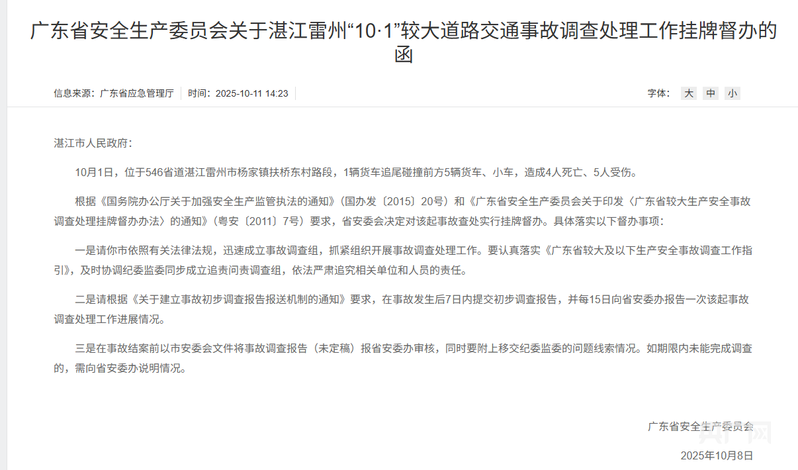 央廣網(wǎng)湛江10月15日消息(記者鄭少純)近日,廣東省應(yīng)急管理廳官網(wǎng)發(fā)布了《廣東省安全生產(chǎn)委員會(huì)關(guān)于湛江雷州“10·1”較大道路交通事故調(diào)查處理工作掛牌督辦的函》。