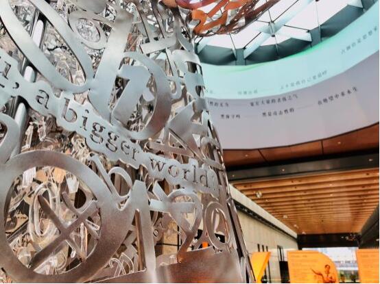 這個(gè)裝置是從1:20的泥塑小稿開始創(chuàng)作的,完成后放大為4米7的等比例模型,經(jīng)過火烤定型。整個(gè)裝置在視覺上呈現(xiàn)的是虛實(shí)結(jié)合的獨(dú)特觀感,并且具有象征意義!苯庥陆忉,堅(jiān)硬的鋼制身體,象征我們通過學(xué)習(xí)獲得堅(jiān)實(shí)的能力;通透奪目的面部與身體內(nèi)部,象征通過學(xué)習(xí)實(shí)現(xiàn)美好的理想。裝置前方發(fā)光的書籍,其實(shí)是裝置的感應(yīng)開關(guān),當(dāng)觀眾翻動(dòng)書頁,將觸發(fā)身后裝置緩緩亮起,這象征著學(xué)習(xí)鑄造自己更好的人生。