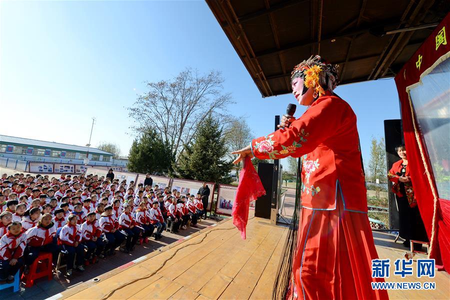 11月21日,評劇演員在河北省樂亭縣汀流河中心小學(xué)為學(xué)生們表演。新華社記者 牟宇 攝