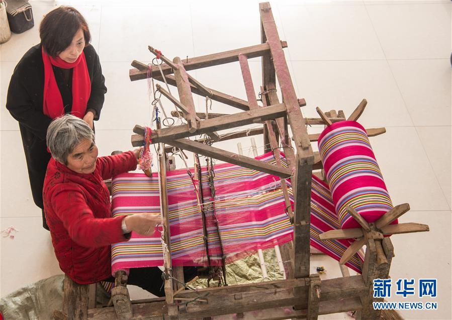 11月27日,在河北省石家莊市欒城區(qū),手工土布藝人馮素芬(左)指導(dǎo)居民織土布。馮素芬是石家莊欒城手工土布藝人。她在傳承當(dāng)?shù)赝敛技徔椉妓嚨耐瑫r(shí),不斷挖掘整理當(dāng)?shù)赝敛嘉幕,培?xùn)當(dāng)?shù)鼐用窦尤氲娇椡敛嫉漠a(chǎn)業(yè)中來,一同開發(fā)土布創(chuàng)意產(chǎn)品,讓更多家庭走上增收致富的道路。新華社發(fā)(蒲東峰 攝)