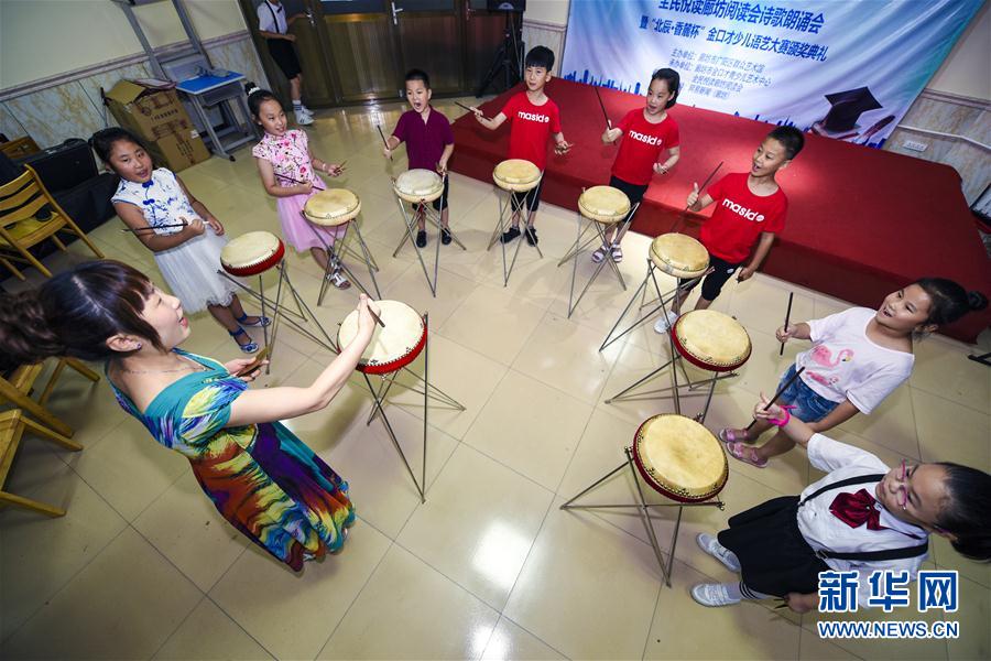 7月4日,在河北省廊坊市廣陽區(qū),孩子們在民樂老師指導下吹奏嗩吶。新華社記者李曉果攝