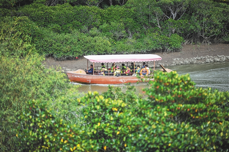 游客坐船游覽海口市東寨港紅樹林旅游區(qū)。海南日報(bào)記者 袁琛 攝