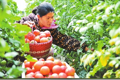 去年,新蔡縣龍口鎮(zhèn)邊劉莊村農(nóng)民王華斌打工返鄉(xiāng)后,籌資500萬元建起200畝的豐園蔬菜種植基地,帶動了40多戶鄉(xiāng)親種植蔬菜。圖為2月18日,王華斌的妻子在采摘西紅柿。趙學(xué)風(fēng) 攝