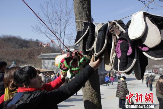 央廣網(wǎng)河南分網(wǎng)消息 據(jù)中國新聞網(wǎng)報道:12月14日,河南省洛陽市木札嶺景區(qū),當(dāng)?shù)剞r(nóng)民將純手工衲制的千層底老布鞋掛在樹上做商品銷售,吸引許多游客駐足觀看。