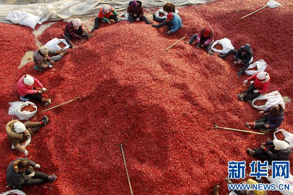 央廣網(wǎng)河南分網(wǎng)消息 據(jù)新華網(wǎng)河南頻道報(bào)道:近日,河南省內(nèi)黃縣種植30余萬畝辣椒喜獲豐收,當(dāng)?shù)剞r(nóng)民抓住晴好天氣進(jìn)行摘收、銷售,鄉(xiāng)間處處是一片火紅。(劉肖坤 攝)
