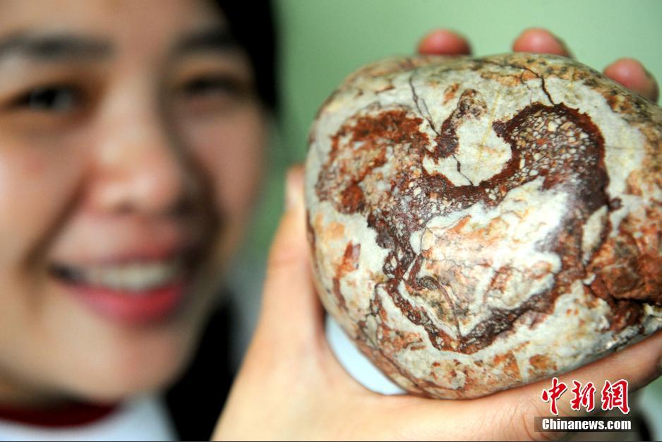 央廣網(wǎng)河南分網(wǎng)消息 據(jù)中國(guó)新聞網(wǎng)報(bào)道:1月9日,福建省福州市一奇石收藏者展示“中國(guó)地圖”奇石。這枚鵝卵石上天然形成了一個(gè)寬8厘米、高6.6厘米的紅褐色圖案,外形酷似一幅中國(guó)大陸版圖。這枚鵝卵石是20多年前在甘肅省和政縣廣通河河畔發(fā)現(xiàn)的,重1.39公斤,質(zhì)地堅(jiān)硬、色澤艷麗、紋理清晰、橢圓秀美。(張晴 攝)