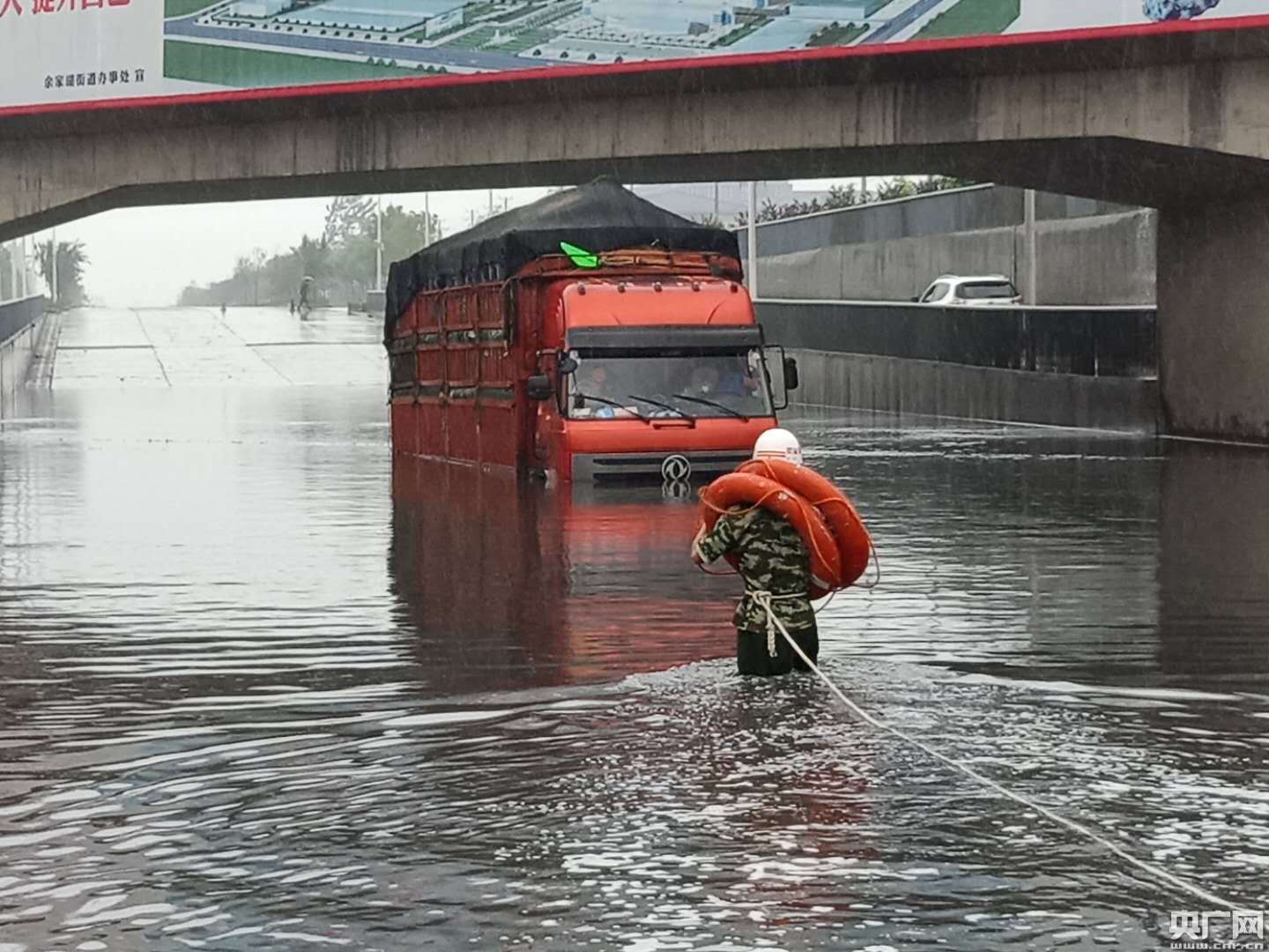 當(dāng)日上午9時(shí)許,消防部門(mén)接到一起報(bào)警,一輛大貨車在經(jīng)過(guò)襄陽(yáng)市余家湖南環(huán)路工業(yè)區(qū)一處涵洞時(shí),導(dǎo)致車輛涉水熄火,包括駕駛員在內(nèi)的兩人被困水中。