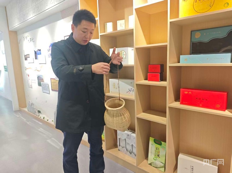 戴文韜介紹采茶體驗裝備(央廣網(wǎng)記者 王錫斐 攝)