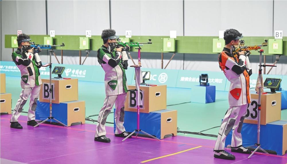 10月15日,遼寧隊選手宋布寒、劉柏辰、馬思涵(從左至右)在男子10米氣步槍團(tuán)體季軍賽中。 新華社發(fā)