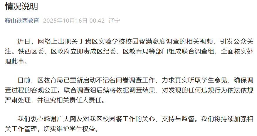 10月16日凌晨,鐵西區(qū)教育局發(fā)布情況說明稱,鐵西區(qū)委、區(qū)政府責(zé)成區(qū)紀(jì)委、區(qū)教育局等部門組成聯(lián)合調(diào)查組,全面核實(shí)處理此事。目前,區(qū)教育局已重新啟動(dòng)不記名問卷調(diào)查工作,力求真實(shí)聽取學(xué)生意見,確保調(diào)查過程的客觀公正。聯(lián)合調(diào)查組后續(xù)將依據(jù)調(diào)查結(jié)果,對(duì)發(fā)現(xiàn)的任何違規(guī)行為依法依規(guī)嚴(yán)肅處理,并追究相關(guān)責(zé)任人責(zé)任。鐵西區(qū)將持續(xù)加強(qiáng)相關(guān)工作管理,切實(shí)維護(hù)學(xué)生權(quán)益。
