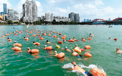 10月2日,來自全國各地數(shù)千名游泳愛好者齊聚廣西柳江暢游。