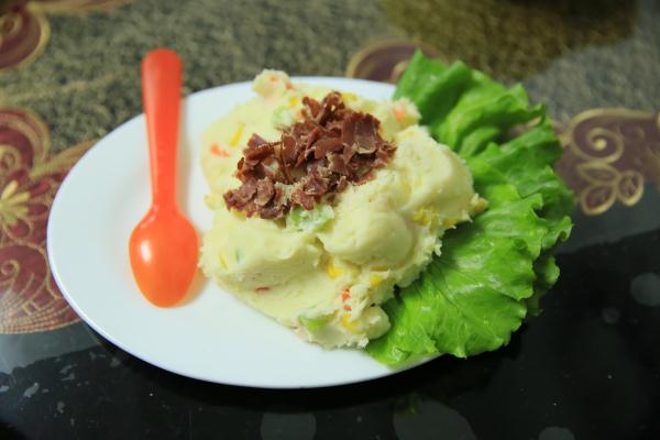 點(diǎn)評(píng):土豆泥很細(xì)膩,加入了玉米、黃瓜和胡蘿卜之后,不光色彩搶眼,而且營養(yǎng)豐富。火腿和沙拉醬的組合,更是讓整道菜帶點(diǎn)淡淡的甜和淡淡的咸鮮,又奶香味十足,非常適合老人孩子食用。