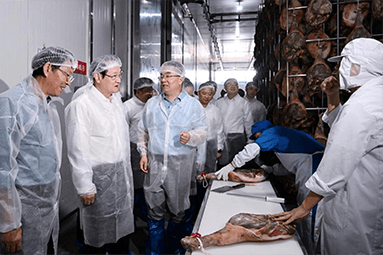 8月22日,金華市委書記朱重烈專程赴金字火腿公司調(diào)研金華火腿產(chǎn)業(yè)振興工作。朱書記在公司領(lǐng)導(dǎo)周國華、馬曉鐘、吳月肖陪同下,走進火腿文化展示館和產(chǎn)品展廳。