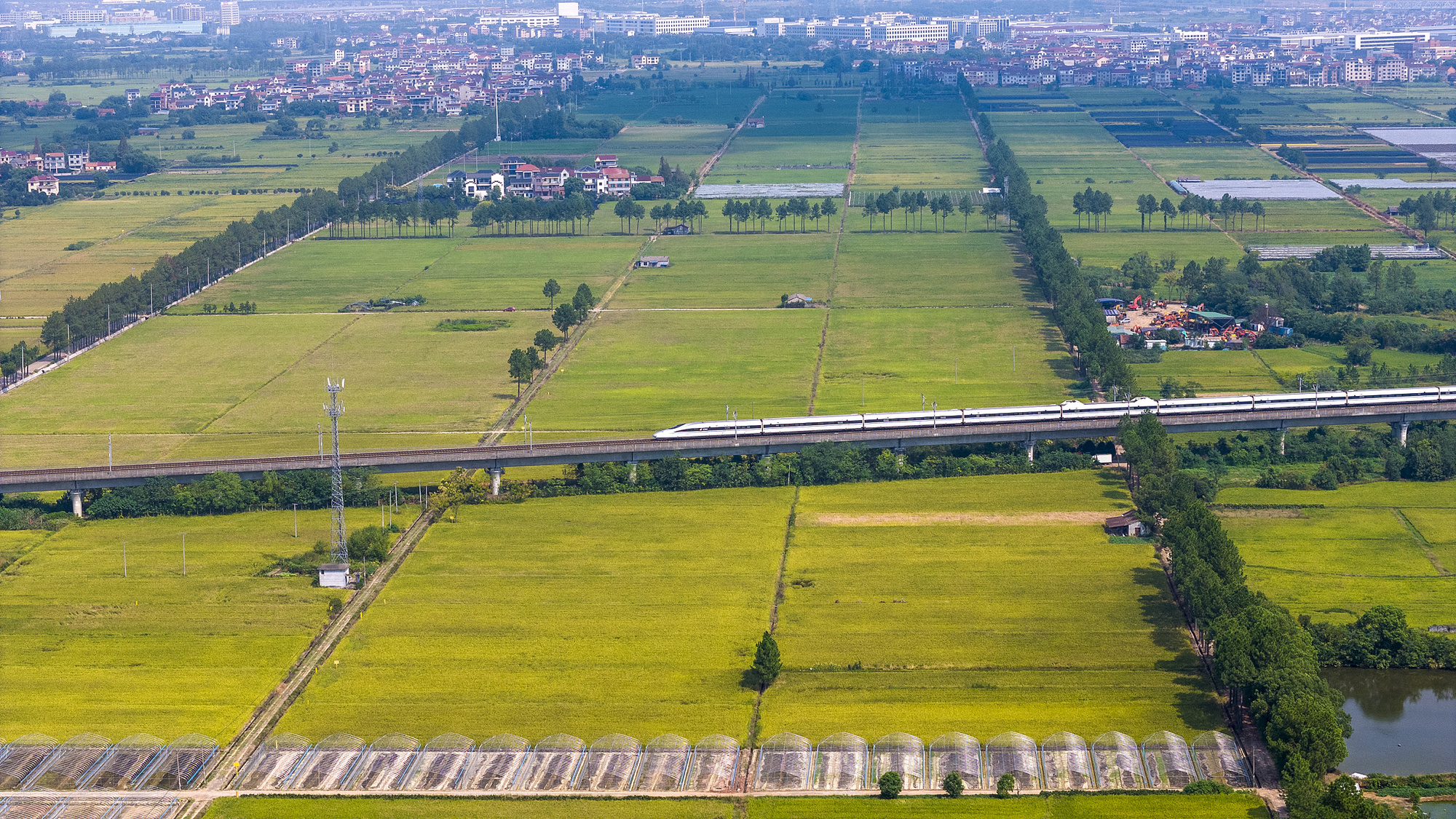 浙江金華:高鐵飛馳穿過金黃色稻田
