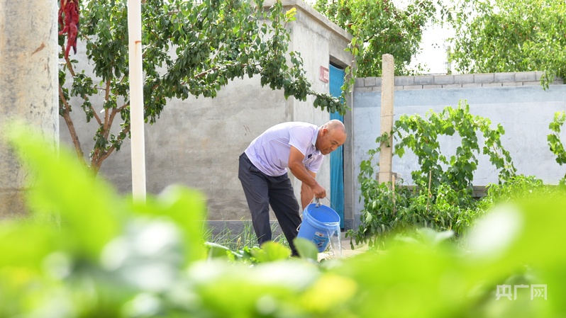劉克瑞用自家水窖中積攢的雨水澆灌花草(央廣網(wǎng)記者 齊平 攝)