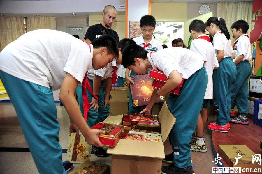 東風東路小學的學生在清點月餅(央廣網(wǎng)記者 鄭澍 攝)