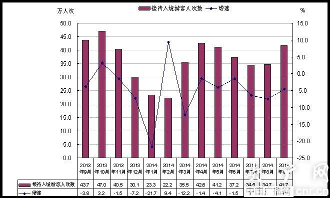 入境旅游市場小幅下降。1-3季度,接待入境游客312.9萬人次,同比下降5.9%。其中,接待港澳臺游客45.4萬人次,下降0.7%;接待外國游客267.5萬人次,下降6.7%。實(shí)現(xiàn)旅游外匯收入33.3億美元,同比下降5.9%。