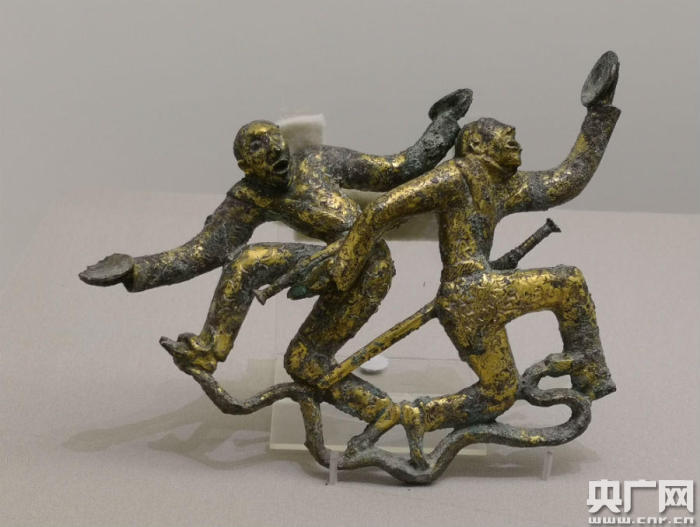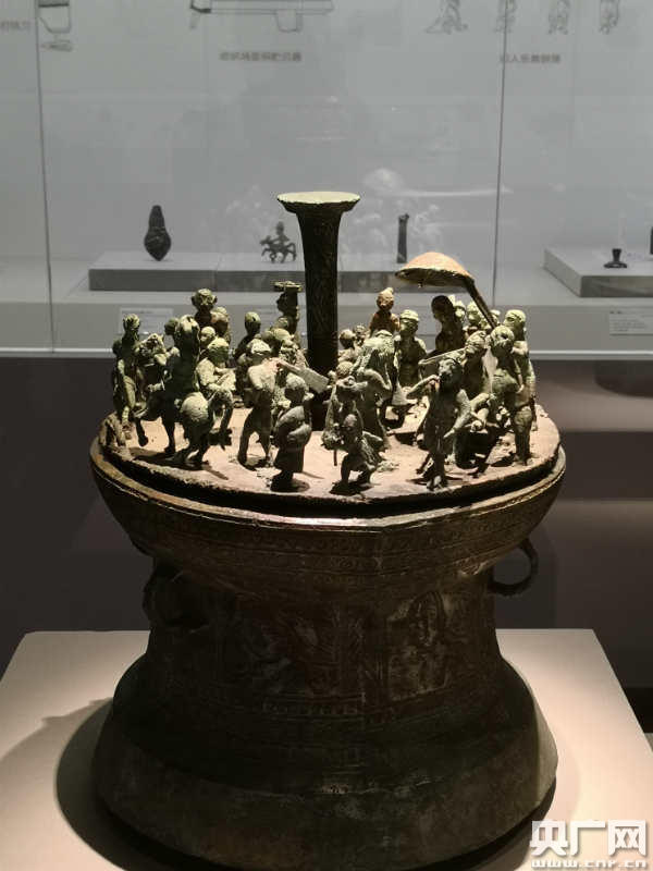 在展覽現(xiàn)場(chǎng),記者看到籍田祭祀場(chǎng)面銅貯貝器、疊鼓形狩獵場(chǎng)面銅貯貝器、四牛鎏金騎士貯貝器、鎏金雙人盤舞銅扣飾等多件精美青銅器。其中,貯貝器是用來(lái)貯藏海貝的青銅容器,是滇青銅文化的獨(dú)特產(chǎn)物,是滇國(guó)王侯貴族身份與地位的象征。籍田祭祀場(chǎng)面銅貯貝器器身為銅鼓形,頂部圓片狀蓋子上圖像表現(xiàn)的是在貴婦人主持下即將舉行一次與農(nóng)業(yè)有關(guān)的祭祀和利用祭祀進(jìn)行趕集貿(mào)易活動(dòng)的場(chǎng)面,布局疏密有致,人物形態(tài)生動(dòng)逼真。疊鼓形狩獵場(chǎng)面銅貯貝器是由兩鼓上下重疊焊鑄而成,器蓋上鑄有立體狩獵場(chǎng)面,是現(xiàn)今出土的滇國(guó)文物中唯一一件表現(xiàn)狩獵場(chǎng)面的疊鼓形貯貝器,在器物線刻紋飾中出現(xiàn)了人物裝扮的類似獅子的形象和長(zhǎng)象牙的動(dòng)物、牦牛等,為滇國(guó)的對(duì)外文化交流提供了新的證據(jù)。四牛鎏金騎士貯貝器束腰圓筒形,器蓋正中鑄有1個(gè)鎏金騎士,頭梳椎髻,腰佩長(zhǎng)劍,穿緊身衣褲,坐騎之馬昂首挺身,張口、翹尾,顯得十分威武,蓋周立雕4牛,腰肥體壯,抬頭垂尾作行走狀。鎏金雙人盤舞銅扣飾上兩名服飾相同的舞者,頭后梳條形小髻,高鼻、深目,著緊身褲,腰部束帶,身側(cè)佩劍,雙手執(zhí)圓盤,作邊歌邊舞狀,其下有1條蛇,口咬前人之右足,尾繞后人之左足。從兩名舞者的形象特征與裝束看,應(yīng)是異域來(lái)客,有學(xué)者認(rèn)為他們是北方草原游牧民族“塞人”。