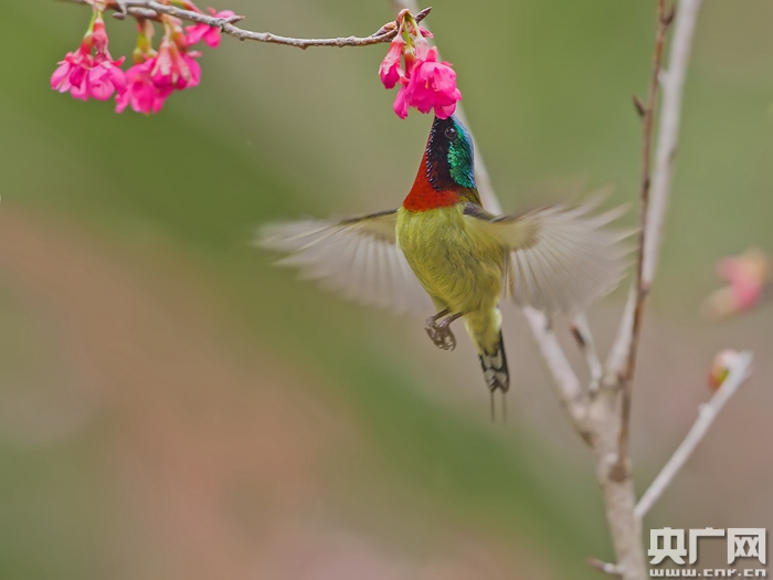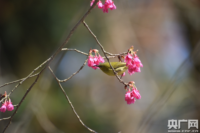 央廣網(wǎng)福州1月30日消息(記者張子亞)眼下,各種櫻花正在福建各地漸次絢爛綻放。花叢間,偶爾響起幾聲細(xì)碎鳥鳴,幾只僅有食指大小的纖弱小鳥在枝頭上下翻飛吸食花蜜,或倒轉(zhuǎn)金勾,或振翅懸停。粉色、赭紅、金屬綠、橄欖黃……花與鳥的明艷色彩構(gòu)成一幅流動(dòng)的美麗花鳥圖。每天,在福州森林公園櫻花園附近的水池邊,這樣的畫面都會(huì)謀殺無(wú)數(shù)長(zhǎng)槍短炮的內(nèi)存。