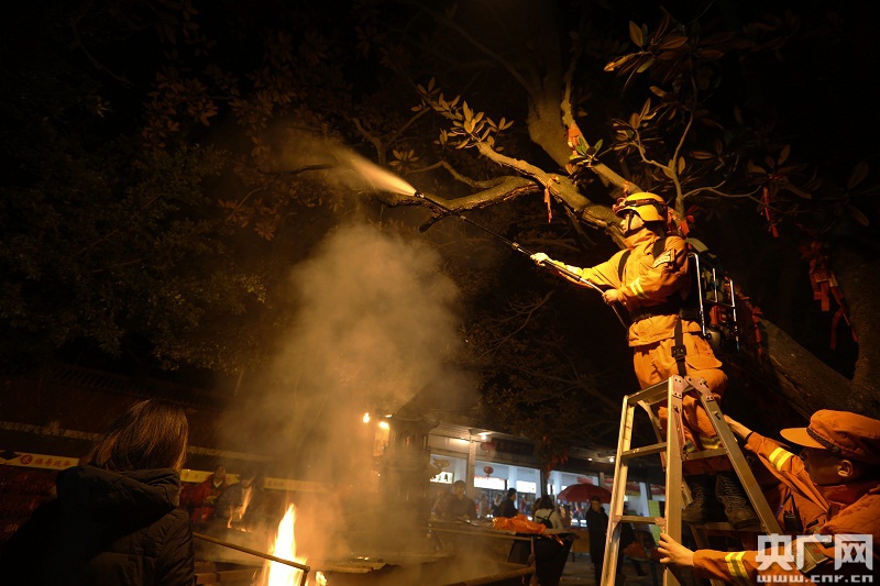 隨著時間推移,接近凌晨前來祈福的市民也越來越多。“森林消防員同志,在大殿右香爐上方樹枝被火苗燎燃,請快速處理!卑l(fā)現(xiàn)險情后,涌泉寺工作人員立即向巡邏小分隊請求支援,班長楊進忠?guī)ьI(lǐng)四名隊員背上細水霧滅火機僅用五分鐘成功處置。