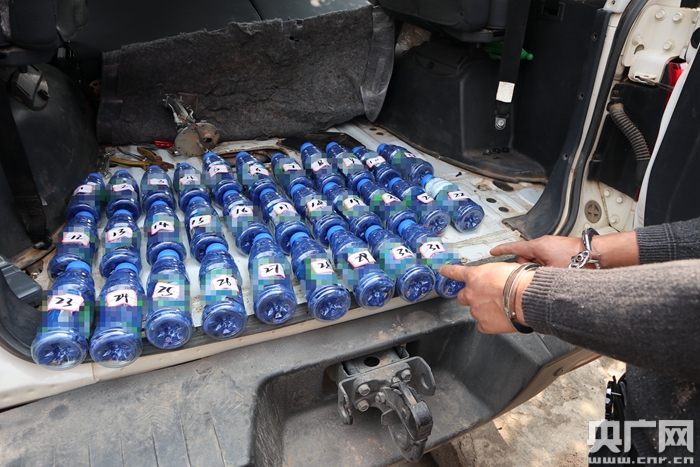 3月9日12時(shí)許,該支隊(duì)軍賽邊境檢查站執(zhí)勤民警在查緝現(xiàn)場對(duì)一輛從孟定開往臨滄方向的越野車進(jìn)行例行檢查時(shí),發(fā)現(xiàn)該車駕車男子面對(duì)詢問神情恍惚、十分緊張,且答非所問,男子的一系列行為引起了執(zhí)勤民警的高度警覺。執(zhí)勤民警遂將該車引導(dǎo)至重點(diǎn)檢查區(qū)域進(jìn)行詳細(xì)檢查,經(jīng)檢查發(fā)現(xiàn)該車后備箱內(nèi)螺絲有擰動(dòng)的痕跡,通過仔細(xì)拆裝檢查,當(dāng)場從該車油箱內(nèi)查獲用藍(lán)色飲料瓶散裝的毒品甲基苯丙胺(冰毒)31瓶,共計(jì)9.49公斤,犯罪嫌疑人被當(dāng)場抓獲。