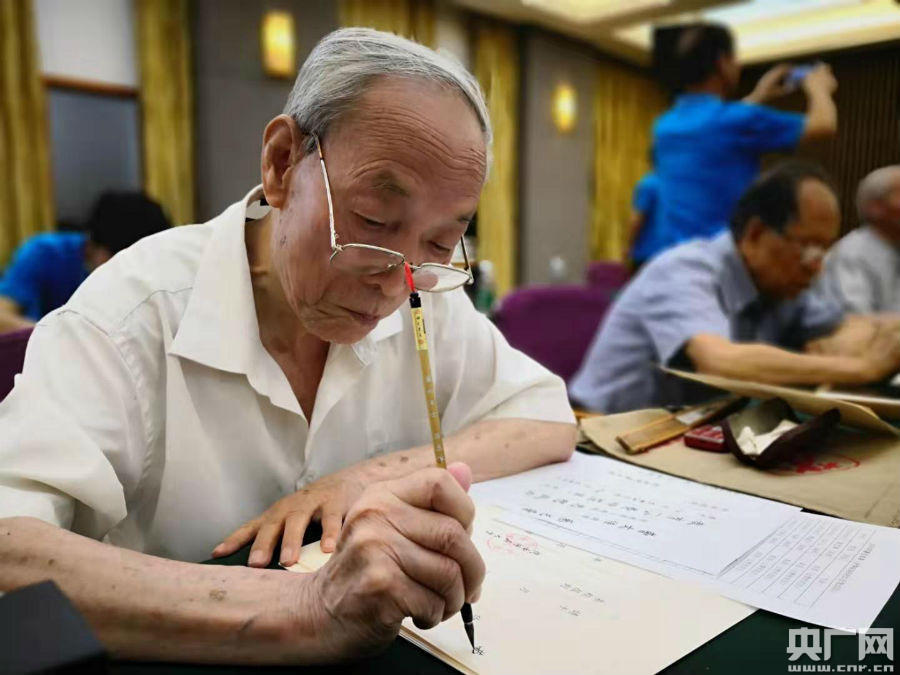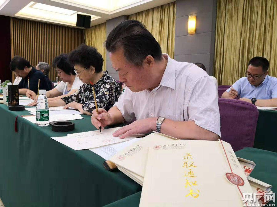 記者在現(xiàn)場看到,老教授們正伏案一絲不茍的用毛筆進行書寫,書寫內(nèi)容包括被錄取學(xué)生的姓名、專業(yè)以及相關(guān)的日期,書寫完一份錄取通知書大約需要兩分鐘時間,他們將用一周時間書寫大約四千五百份錄取通知書。