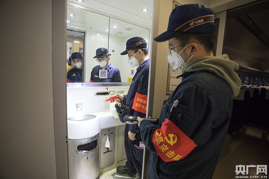 成都動(dòng)車段90后黨員樊楊和青年突擊隊(duì)員黃強(qiáng)在對(duì)動(dòng)車廁所消毒(央廣網(wǎng)發(fā) 通訊員供圖)