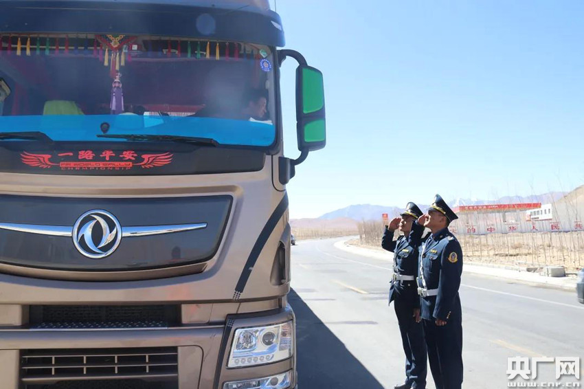 阿里公路部門路政執(zhí)法人員檢查貨運(yùn)車輛(央廣網(wǎng)發(fā) 西藏自治區(qū)路政管理局供圖)