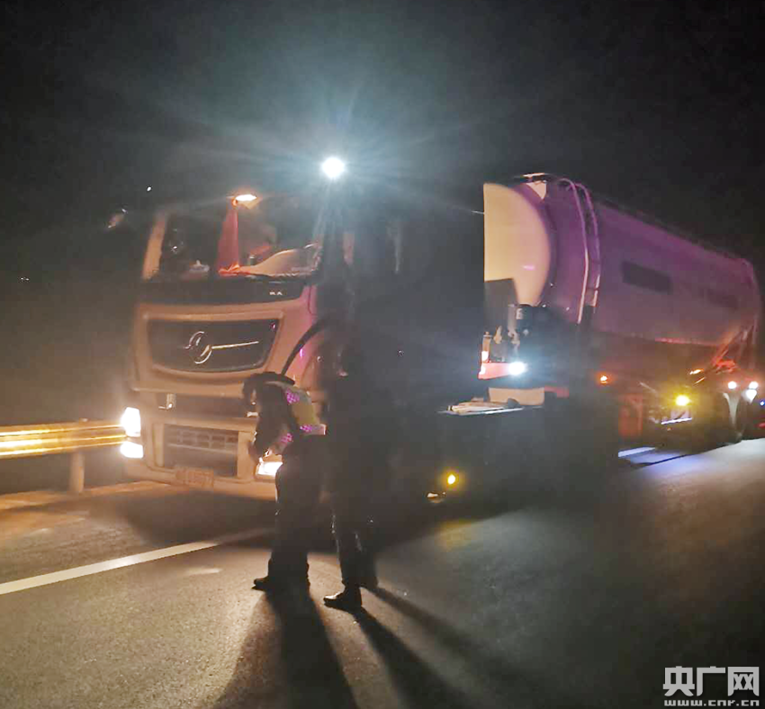 拉貢機(jī)場(chǎng)高速公路養(yǎng)護(hù)中心路政人員查處違規(guī)上高速的大型貨運(yùn)車(央廣網(wǎng)發(fā) 西藏自治區(qū)路政管理局供圖)