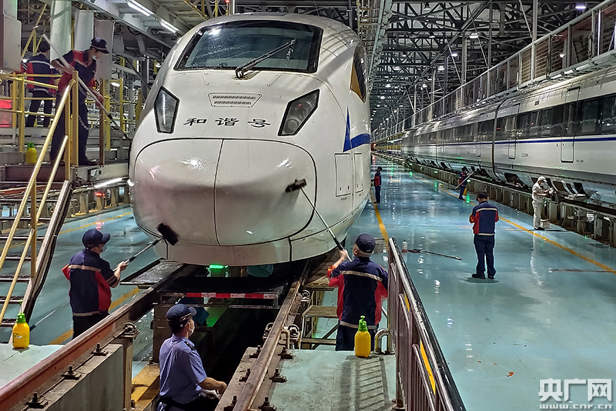 保潔人員正在對(duì)動(dòng)車組頭燈和司機(jī)室擋風(fēng)玻璃進(jìn)行清潔(央廣網(wǎng)發(fā) 通訊員馬明晶 攝)