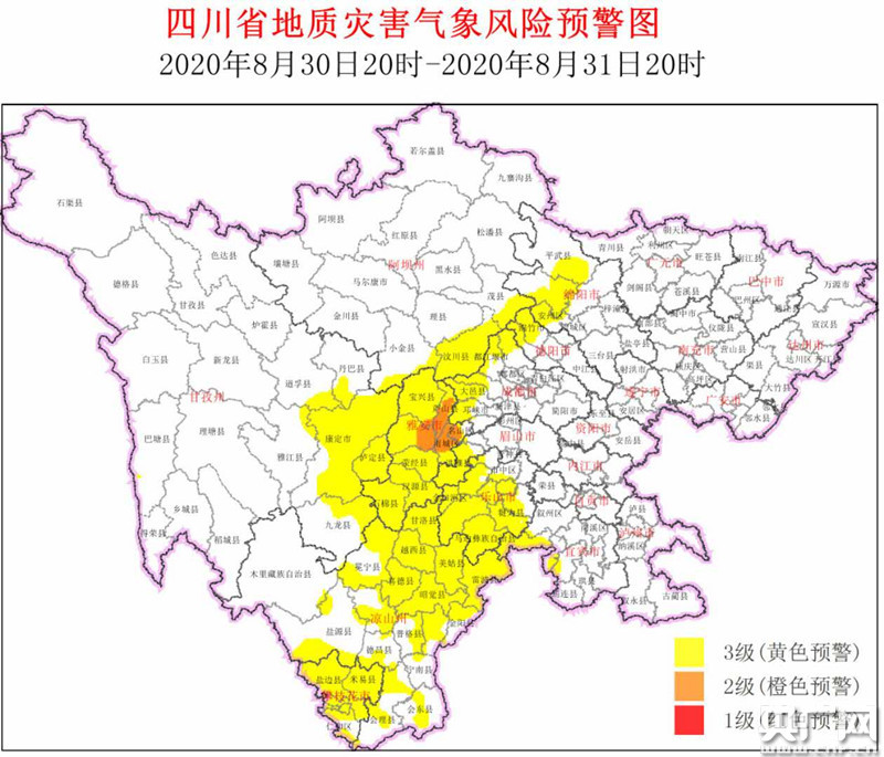 3級(jí)黃色預(yù)警區(qū)域?yàn)檠虐、樂山、攀枝花、涼?市(州),綿陽安州區(qū)、平武縣、北川縣、江油市,德陽綿竹市、什邡市,成都彭州市、都江堰市、崇州市、大邑縣、邛崍市、蒲江縣,眉山洪雅縣、丹棱縣,宜賓敘州區(qū)、高縣、屏山縣,阿壩州汶川縣、茂縣、理縣、小金縣,甘孜州康定市、瀘定縣、丹巴縣、九龍縣、雅江縣、道孚縣、巴塘縣。