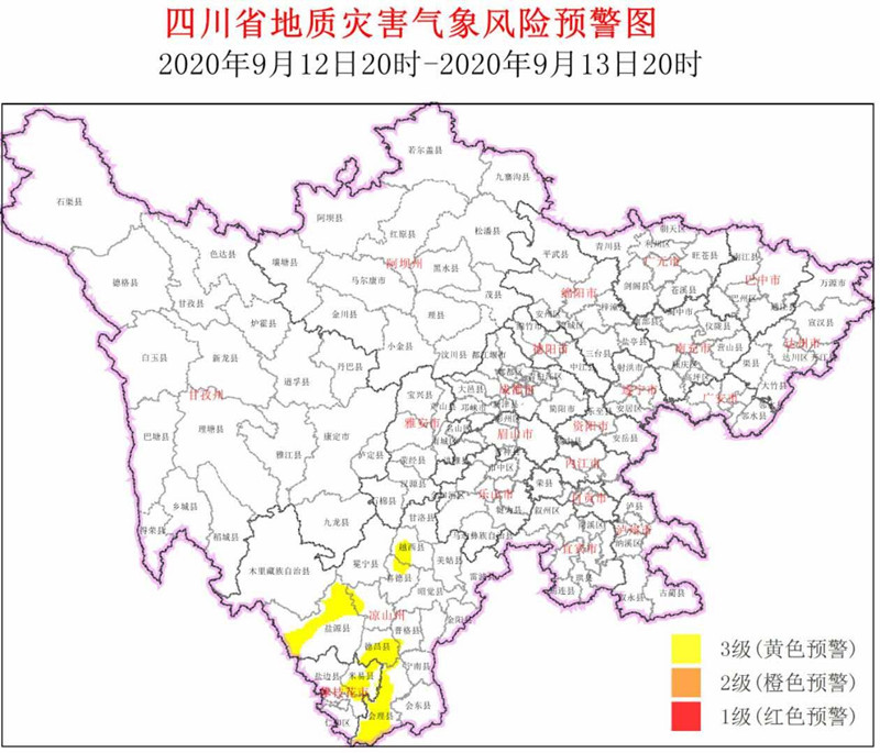 央廣網(wǎng)成都9月12日消息(記者劉濤)9月12日,四川省地質(zhì)災(zāi)害指揮部辦公室發(fā)布地質(zhì)災(zāi)害氣象風(fēng)險(xiǎn)3級(jí)黃色預(yù)警:9月12日20時(shí)至9月13日20時(shí),預(yù)警區(qū)域?yàn)榕手滓卓h、鹽邊縣、仁和區(qū),涼山州西昌市、鹽源縣、德昌縣、會(huì)理縣、普格縣、喜德縣、越西縣。