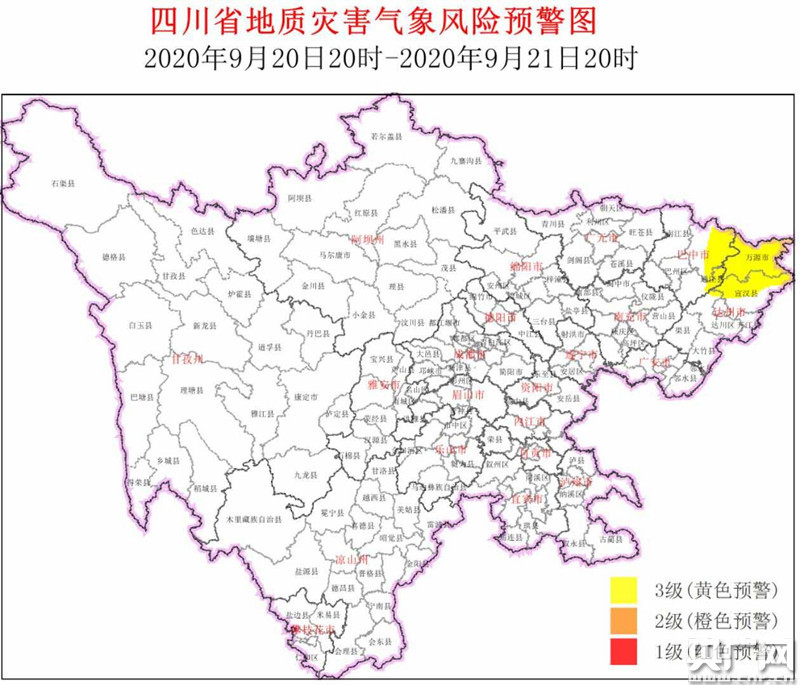 央廣網(wǎng)成都9月20日消息(記者劉濤)結(jié)合四川省氣象臺(tái)天氣預(yù)報(bào)情況,四川省地質(zhì)災(zāi)害指揮部辦公室發(fā)布9月20日20時(shí)至9月21日20時(shí),全省地質(zhì)災(zāi)害氣象風(fēng)險(xiǎn)3級(jí)黃色預(yù)警。