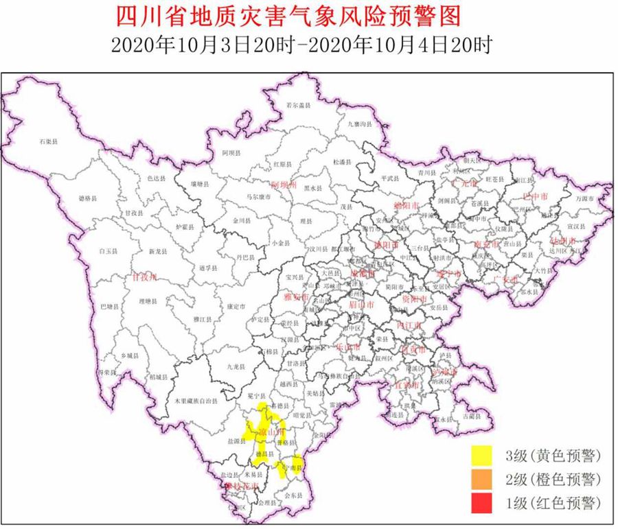 央廣網(wǎng)成都10月3日消息(記者劉濤)結(jié)合四川省氣象臺(tái)天氣預(yù)報(bào)情況,四川省地質(zhì)災(zāi)害指揮部辦公室發(fā)布10月3日20時(shí)~10月4日20時(shí),全省地質(zhì)災(zāi)害氣象風(fēng)險(xiǎn)預(yù)警3級(jí)黃色預(yù)警。